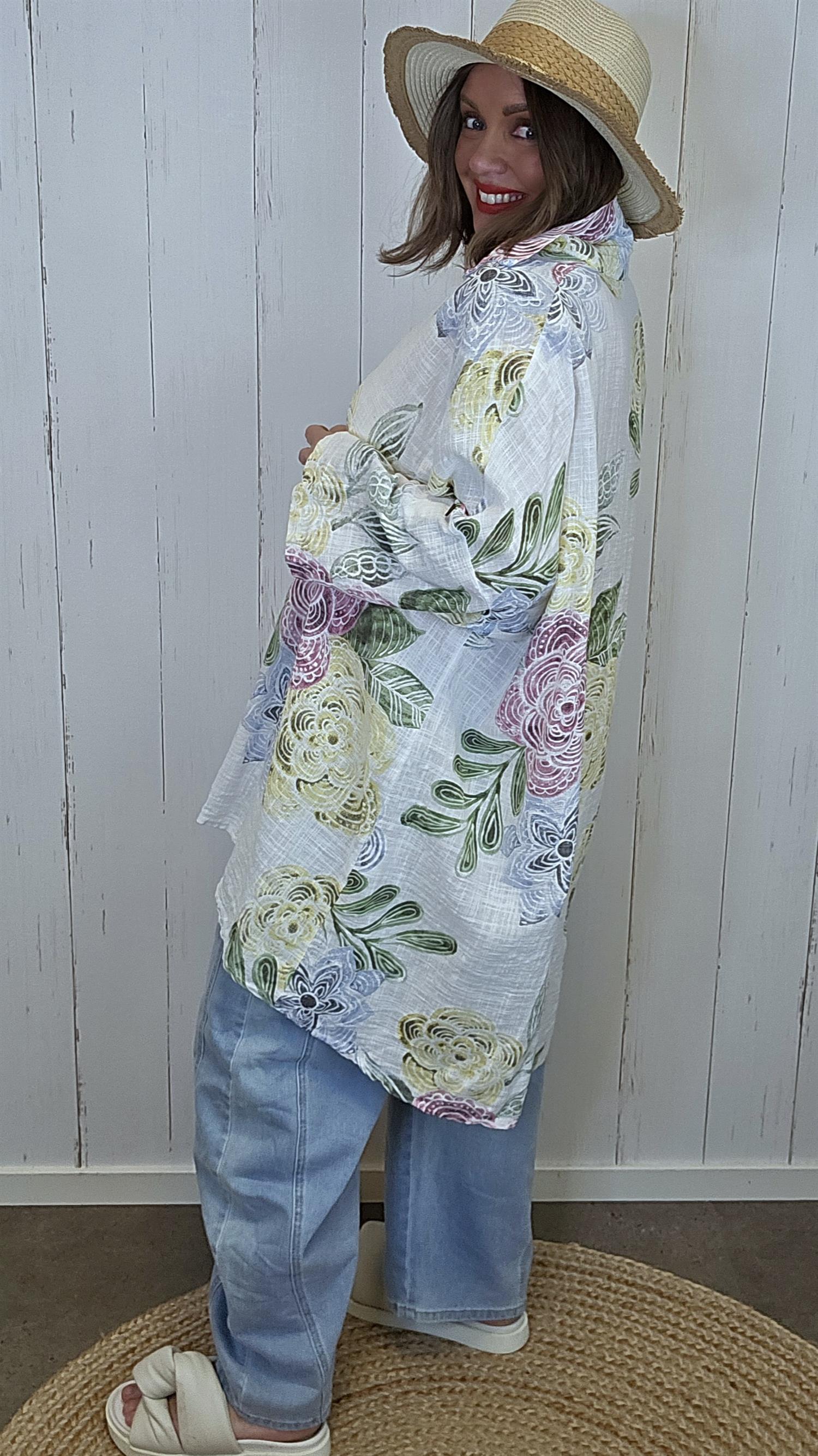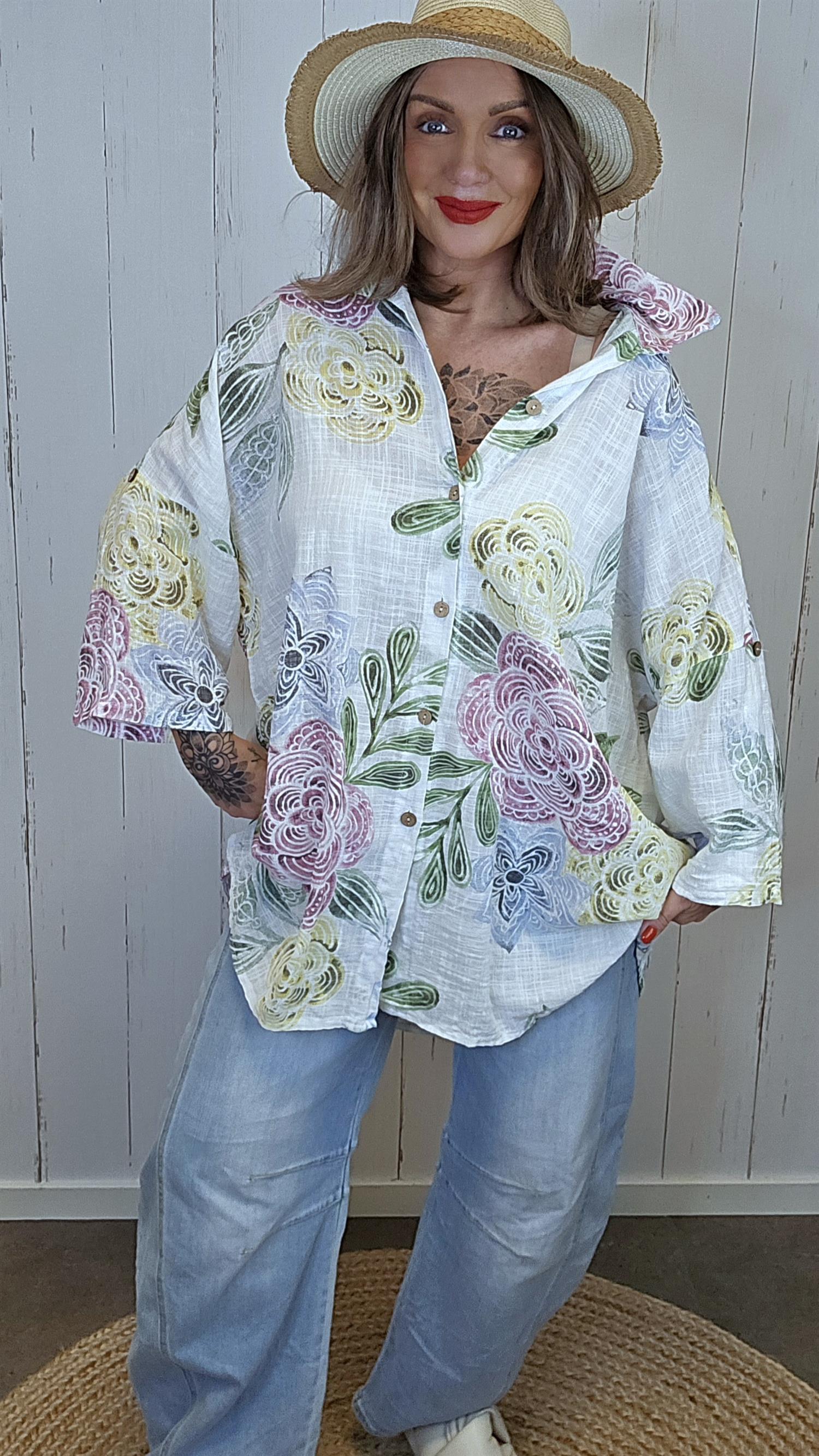 Lett og luftig lang skjorte i myk bomullskvalitet med et moderne og kunstnerisk uttrykk. Skjorten har klassisk krage, knappestolpe i front og en avslappet passform som faller fint på kroppen. Det unike mønsteret gir et trendy og personlig preg, mens lengden gjør den perfekt både lukket som kjole eller åpen som en lett skjortejakke. Et allsidig plagg som passer til både hverdag og ferie.