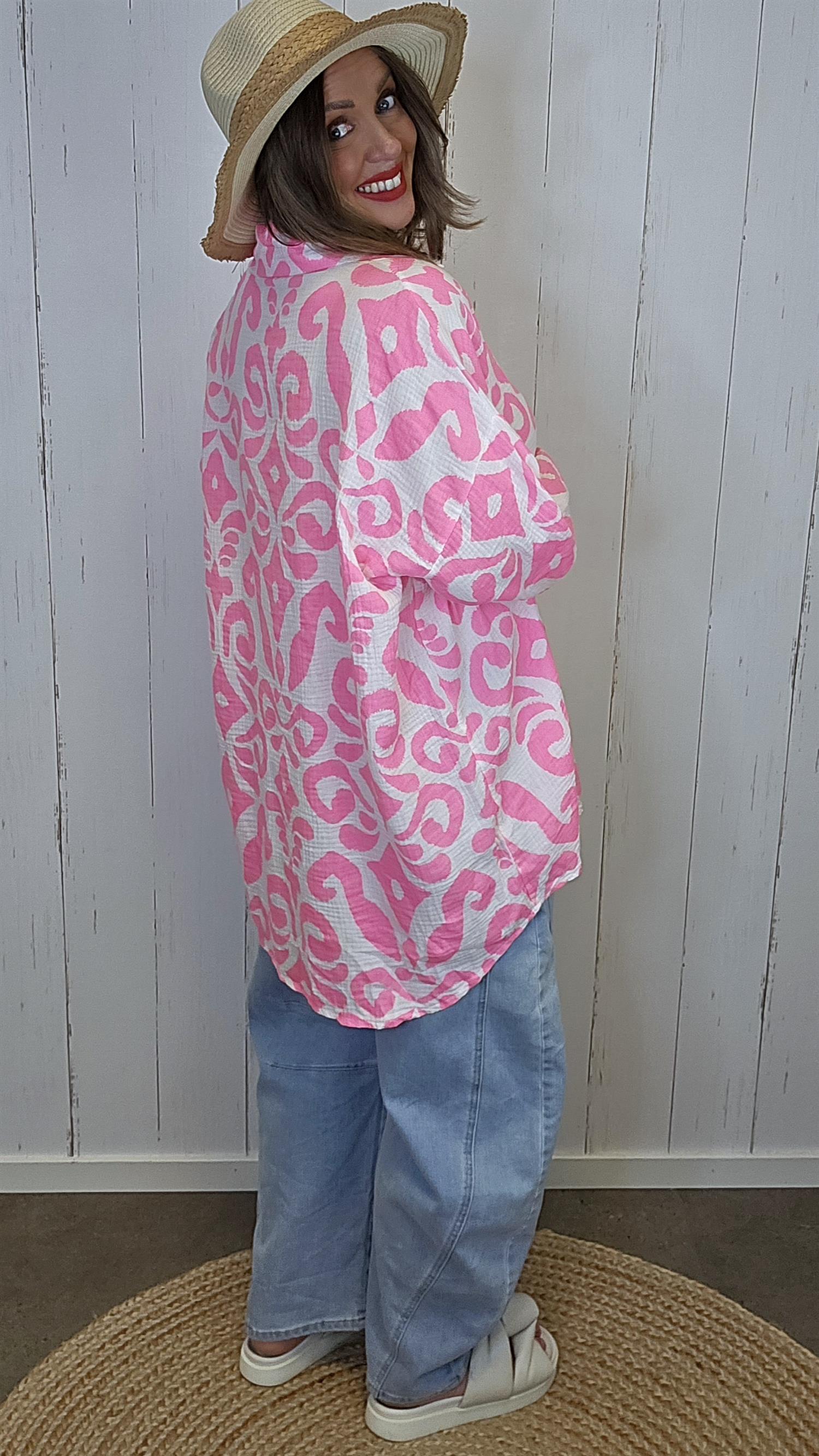 Lett og luftig skjorte i myk bomull med strukturert vaffelmønster som gir et moderne og avslappet uttrykk. Skjorten har klassisk krage, knappestolpe i front og en løs passform som faller fint på kroppen. Det iøynefallende mønsteret i rosa toner gir et friskt og sommerlig preg, perfekt til både hverdag og ferie. Ermene kan brettes opp og festes for en mer casual look.