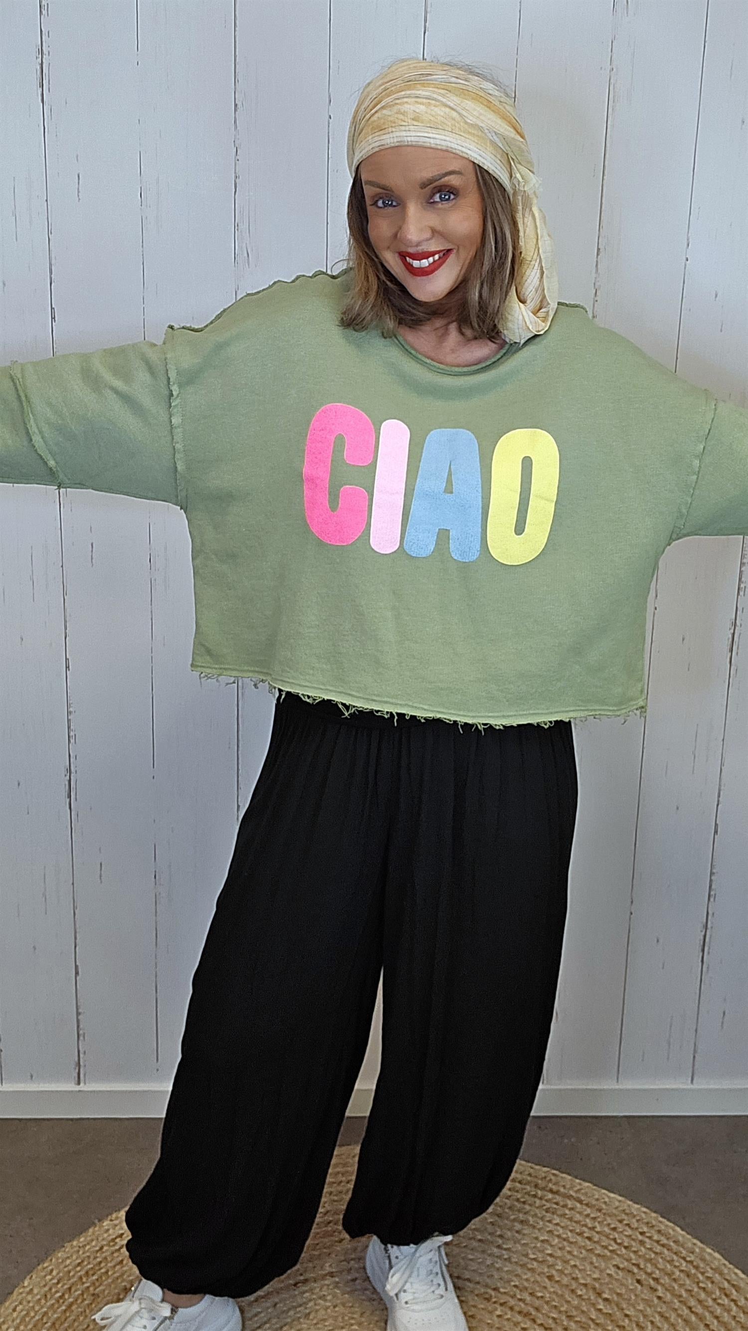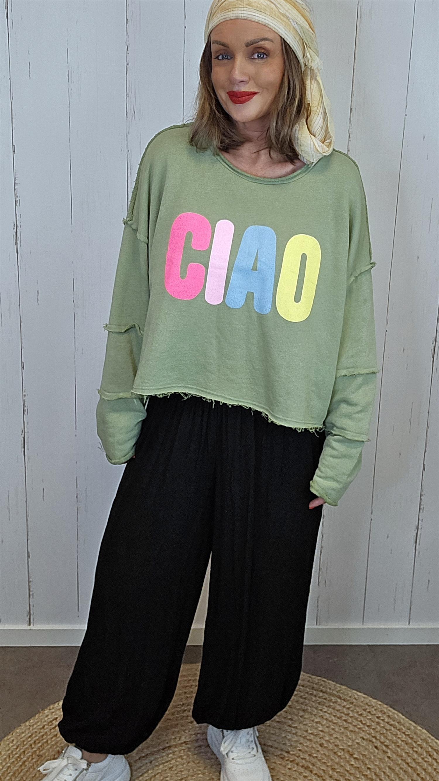 Myk og komfortabel genser i lett bomullskvalitet med et avslappet og trendy uttrykk. Genseren har rund hals, løs passform og råkanter som gir en moderne og litt edgy look. Det fargerike “CIAO”-trykket i front tilfører et lekent og fresht preg. Perfekt til hverdags – like fin til jeans som til en mer avslappet sommerstil.