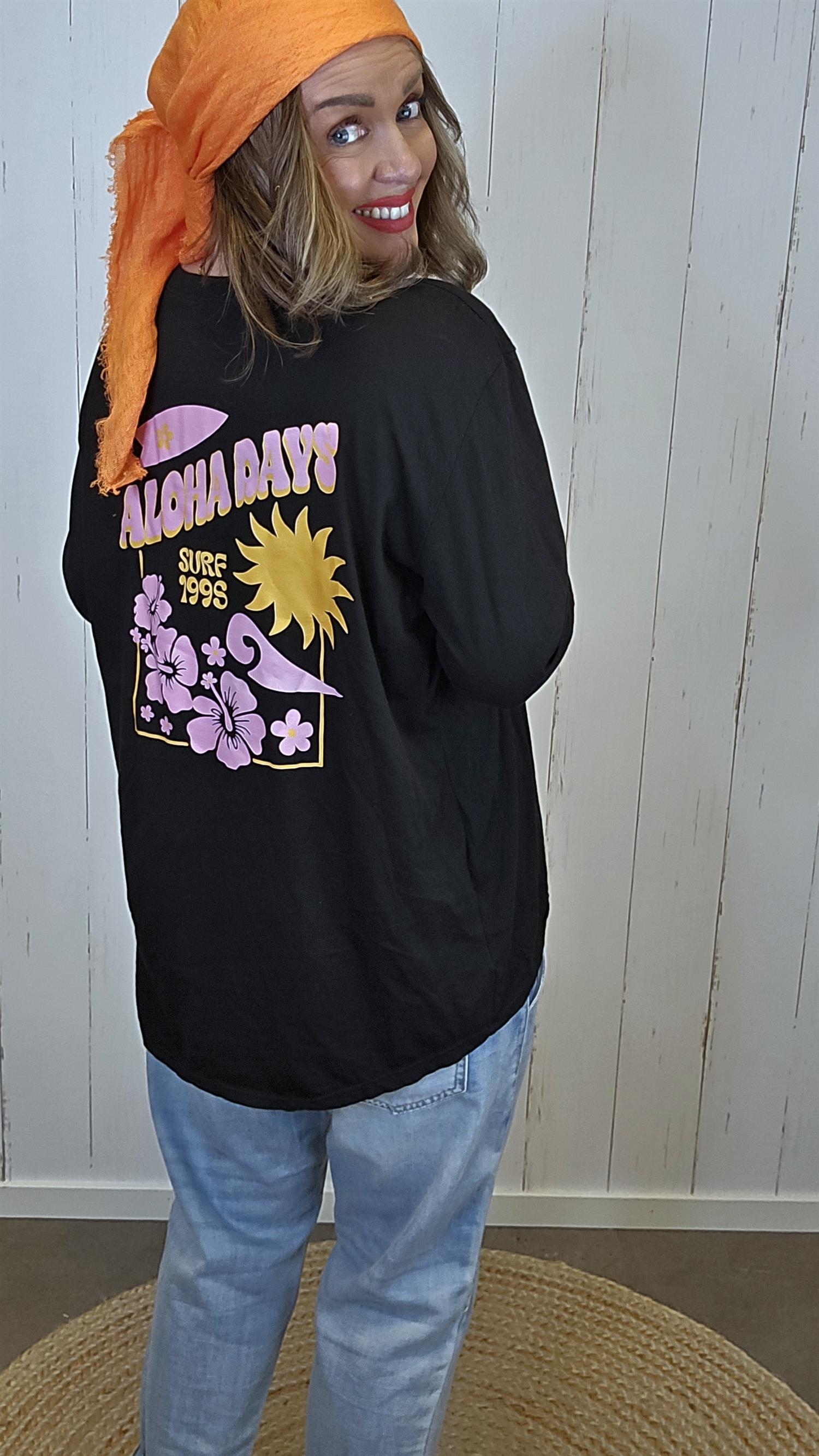 På ryggen har den et stort og fargerikt “ALOHA DAYS”-print med blomster- og surfedetaljer som gir et lekent og sommerlig preg. Dette gjør toppen ekstra unik og til et blikkfang både forfra og bakfra.