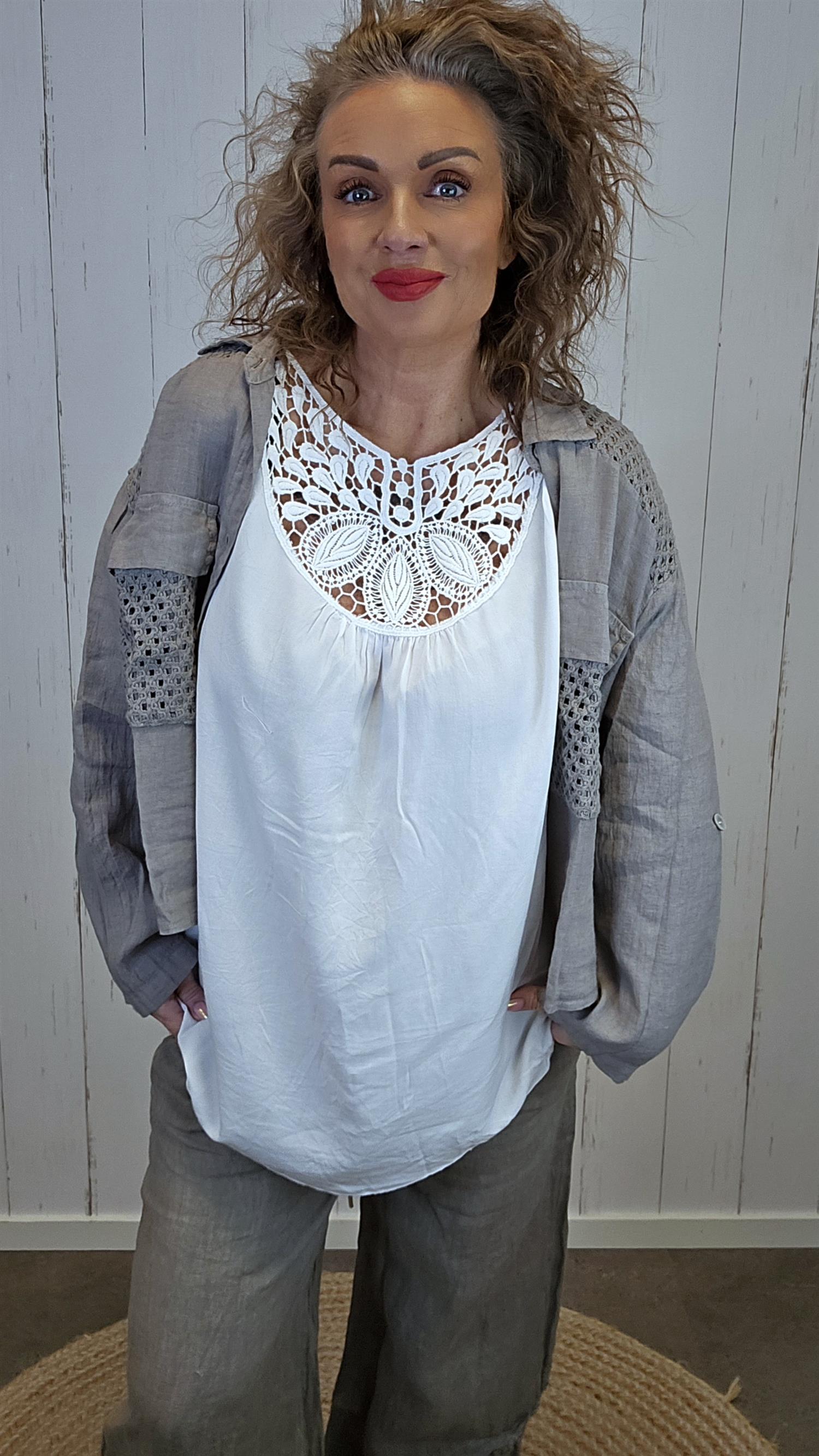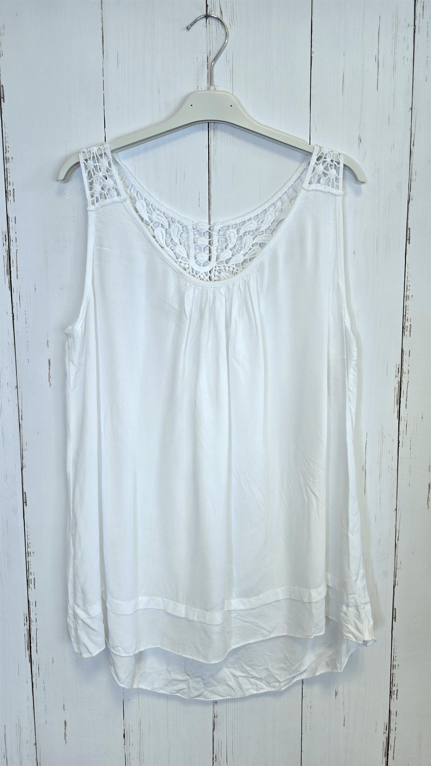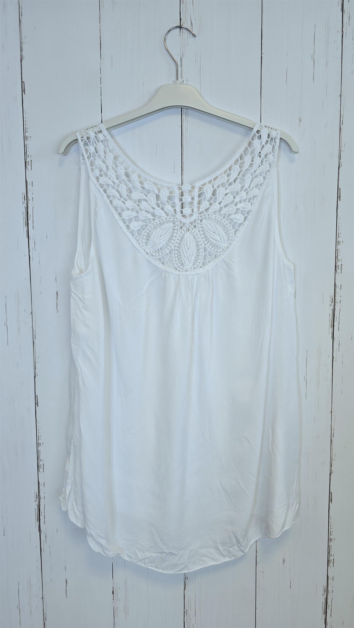 Lett og feminin topp med brede stropper og dekorativ blondedetalj over bryst og skuldre. Toppen har en løs og behagelig passform som faller fint på kroppen, og blondemønsteret gir plagget et elegant og sommerlig preg.