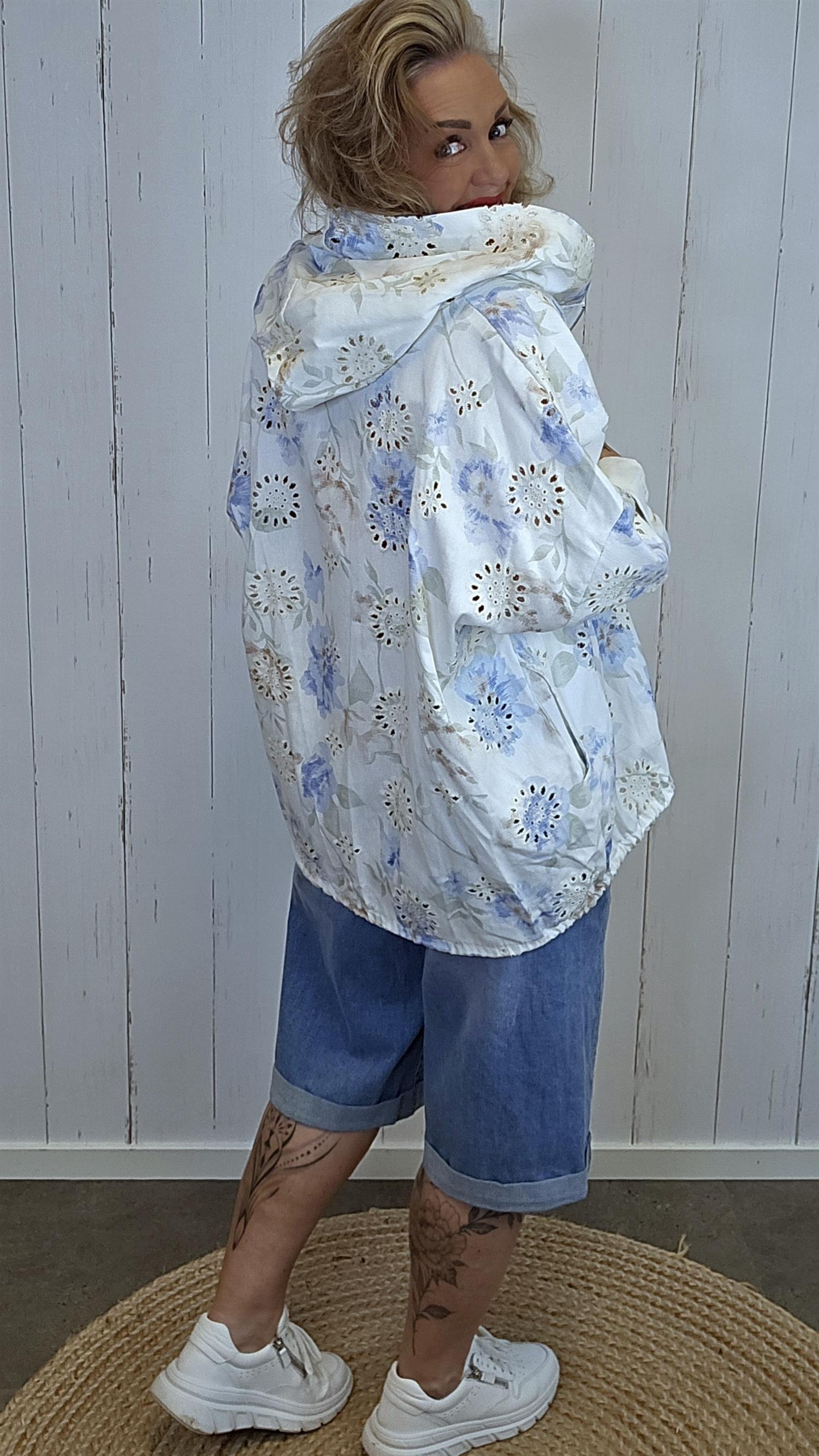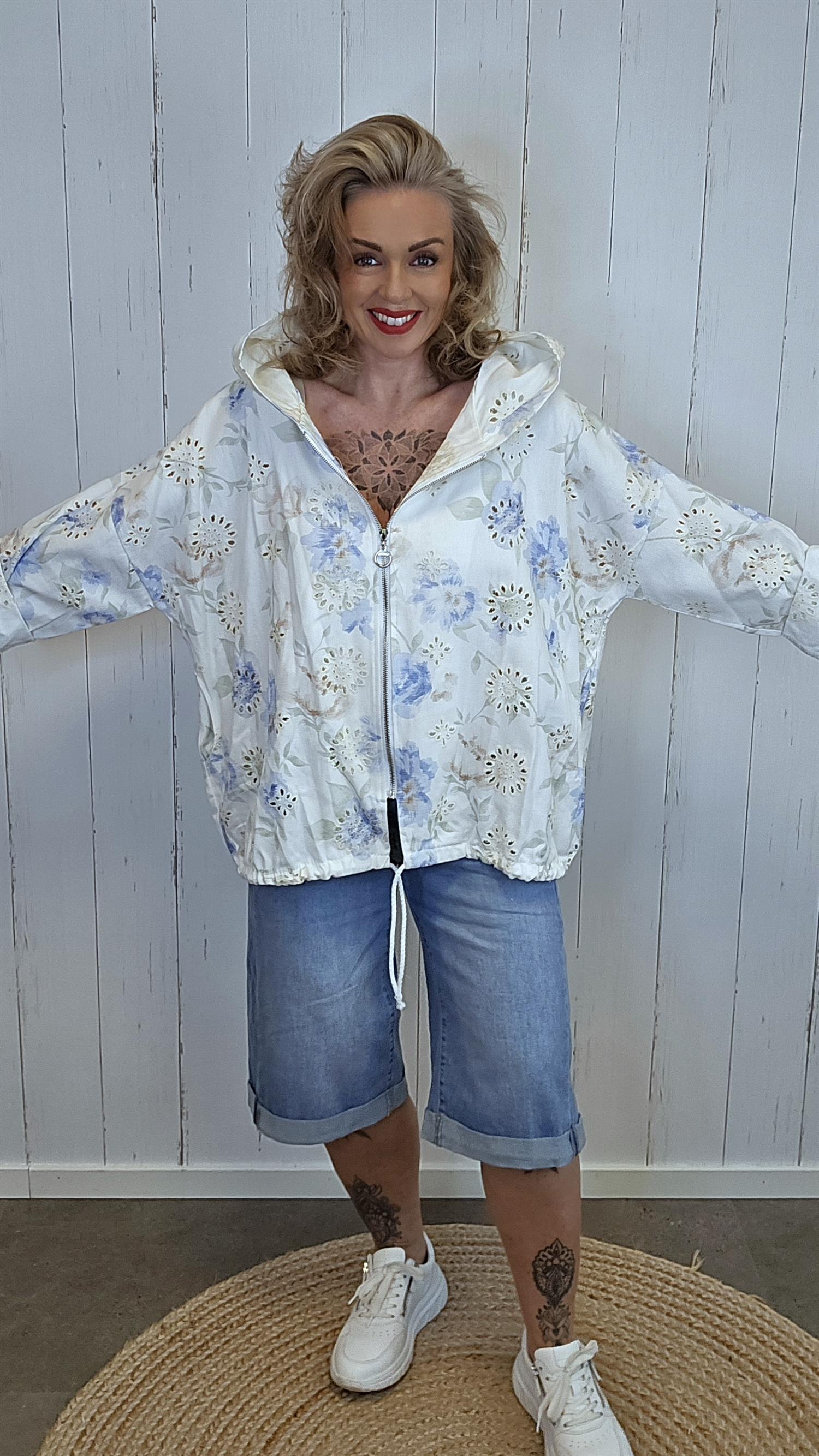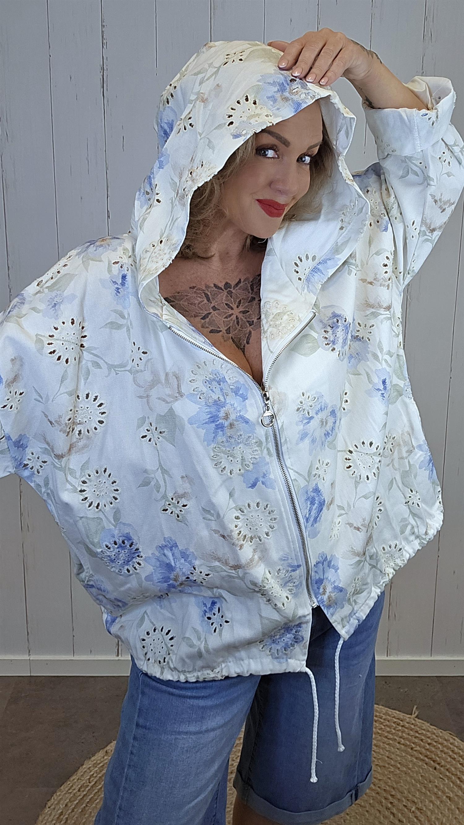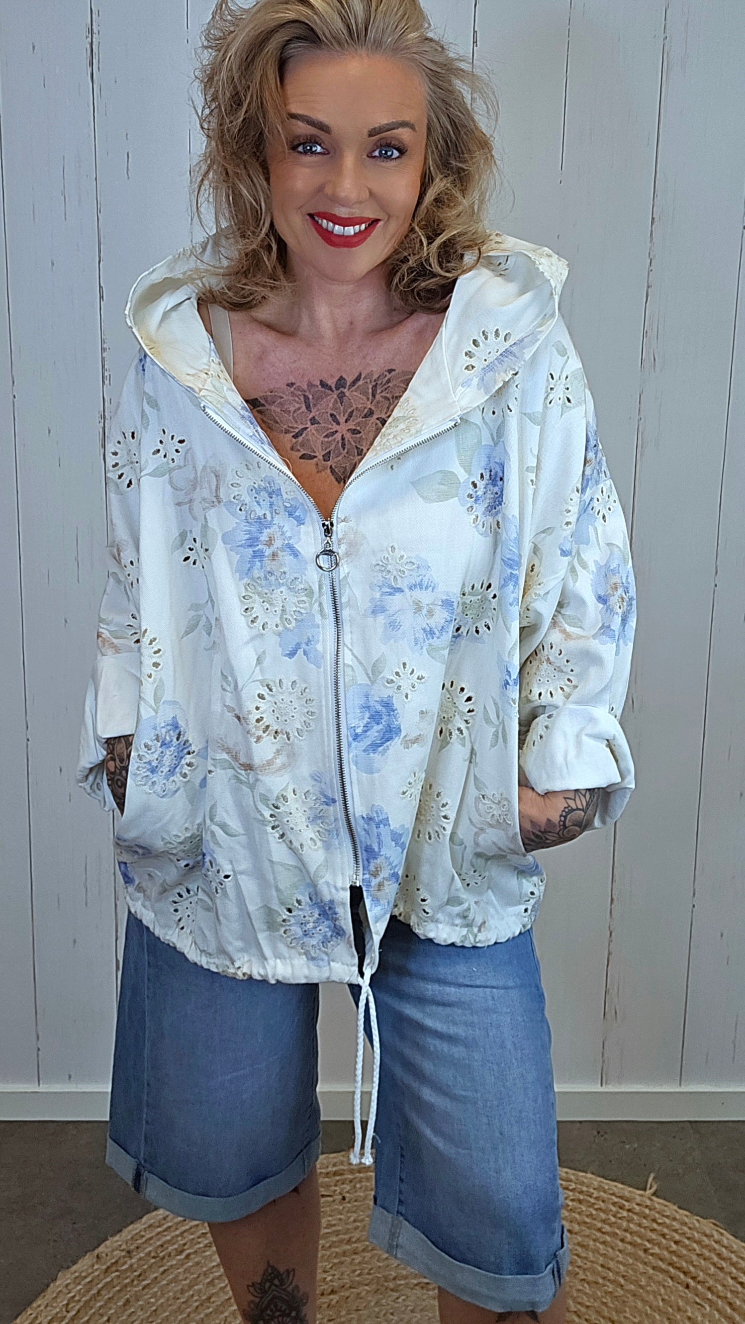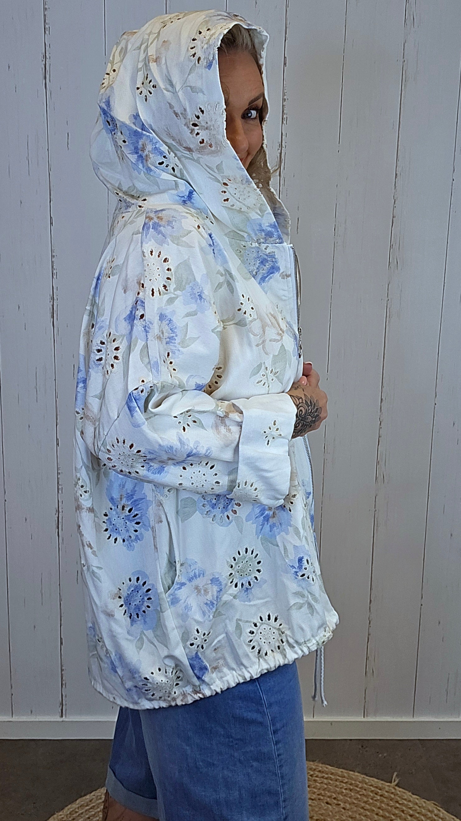 Jakken har en avslappet passform med glidelås i front og hette som gir et sporty, men samtidig romantisk uttrykk. Det fine blomsterprintet går gjennom hele plagget – også på hetten – og gir et helhetlig og eksklusivt preg. Nederst har jakken knyting som gjør at du kan justere passformen etter ønske.